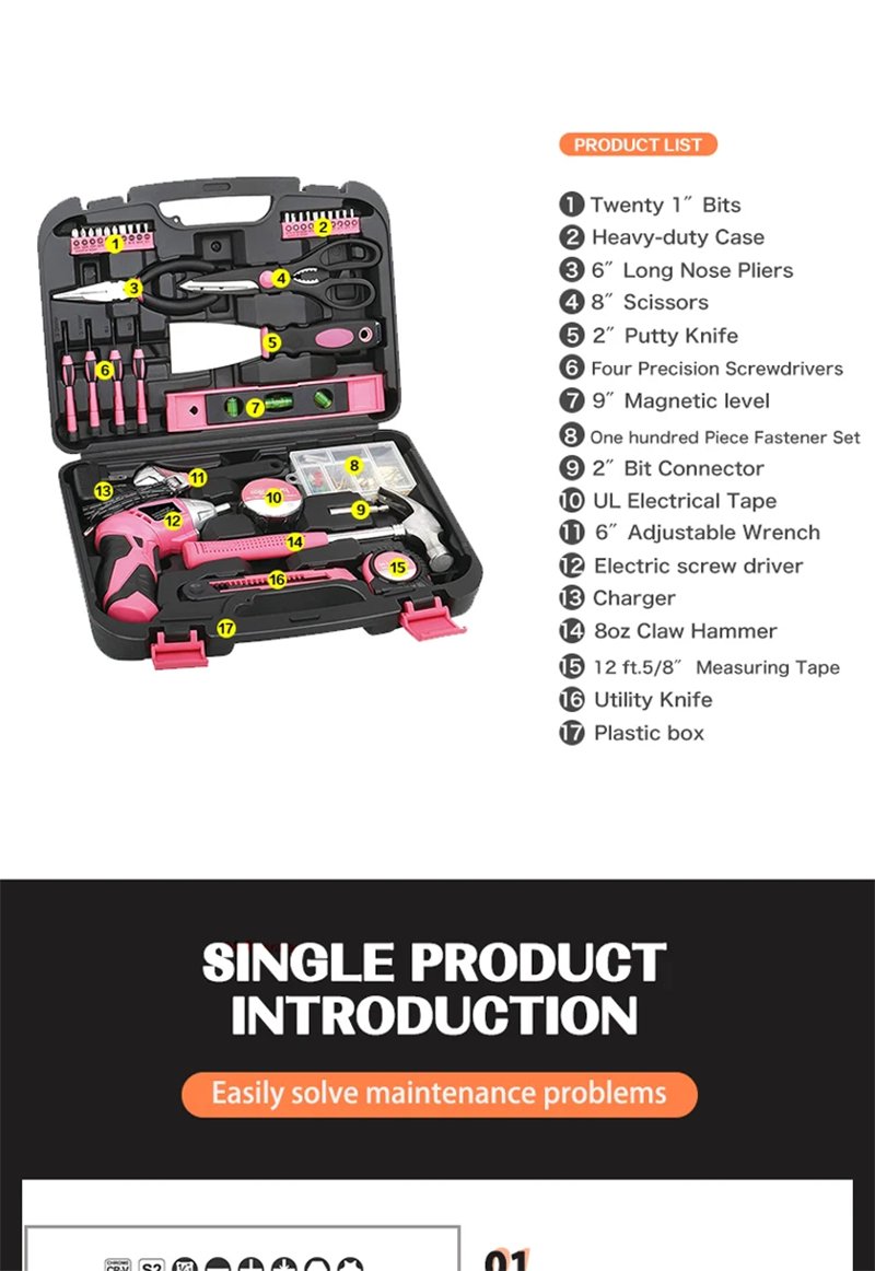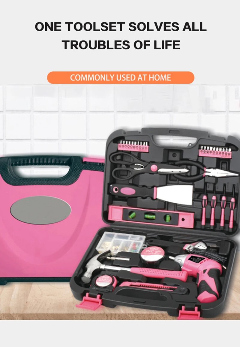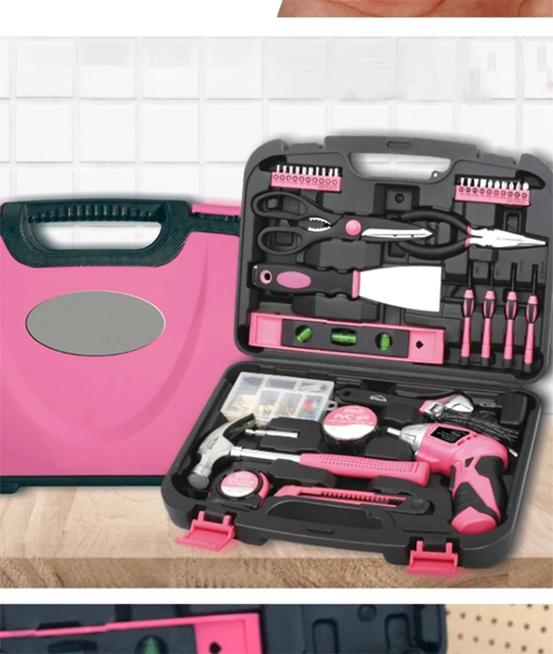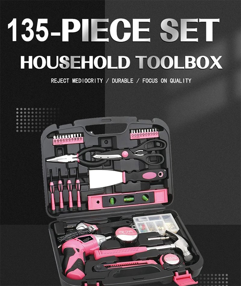 1 กล่อง = 4 ชิ้น ชุดเครื่องมือในครัวเรือน 135 ชิ้น สีชมพู พร้อมไขควงไร้สายลิเธียมไออน 3.6 โวลต์ แบบปรับหมุนได้ 2 มุม