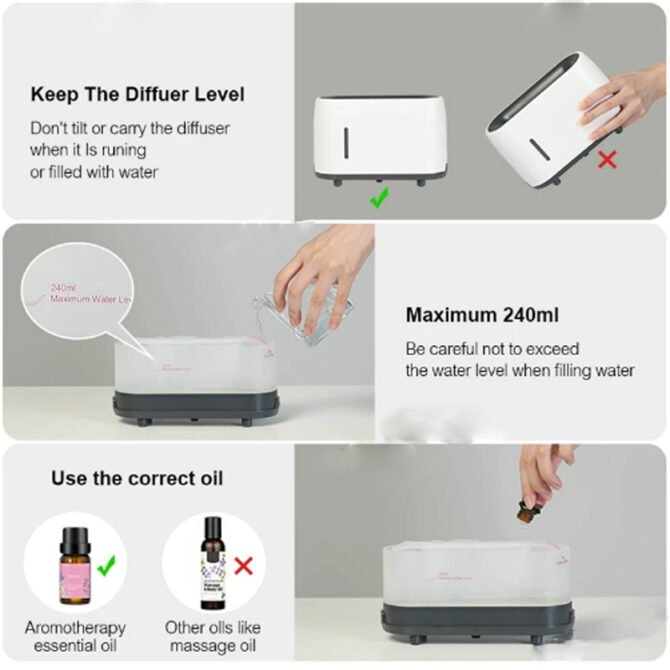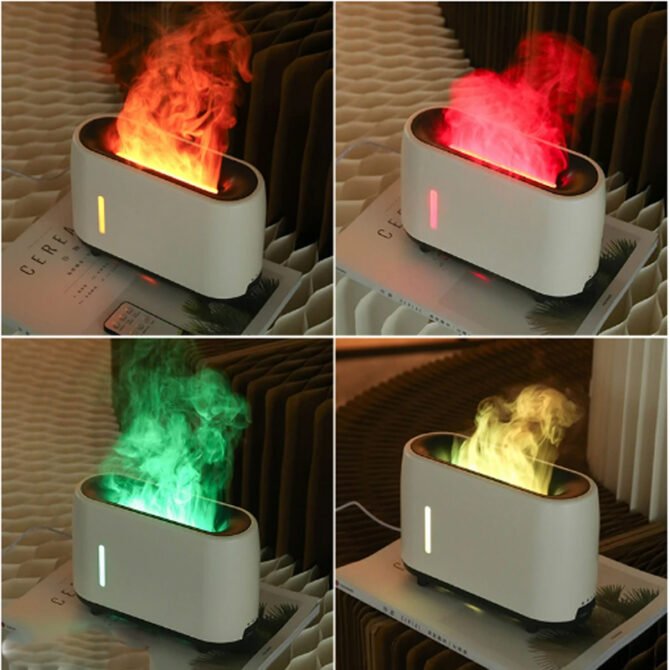 This diffuser is powered by a 24V adapter, and the flame light effect is more powerful and realistic than the USB-powered version. The adapter’s current is more stable, so it is designed to last longer.