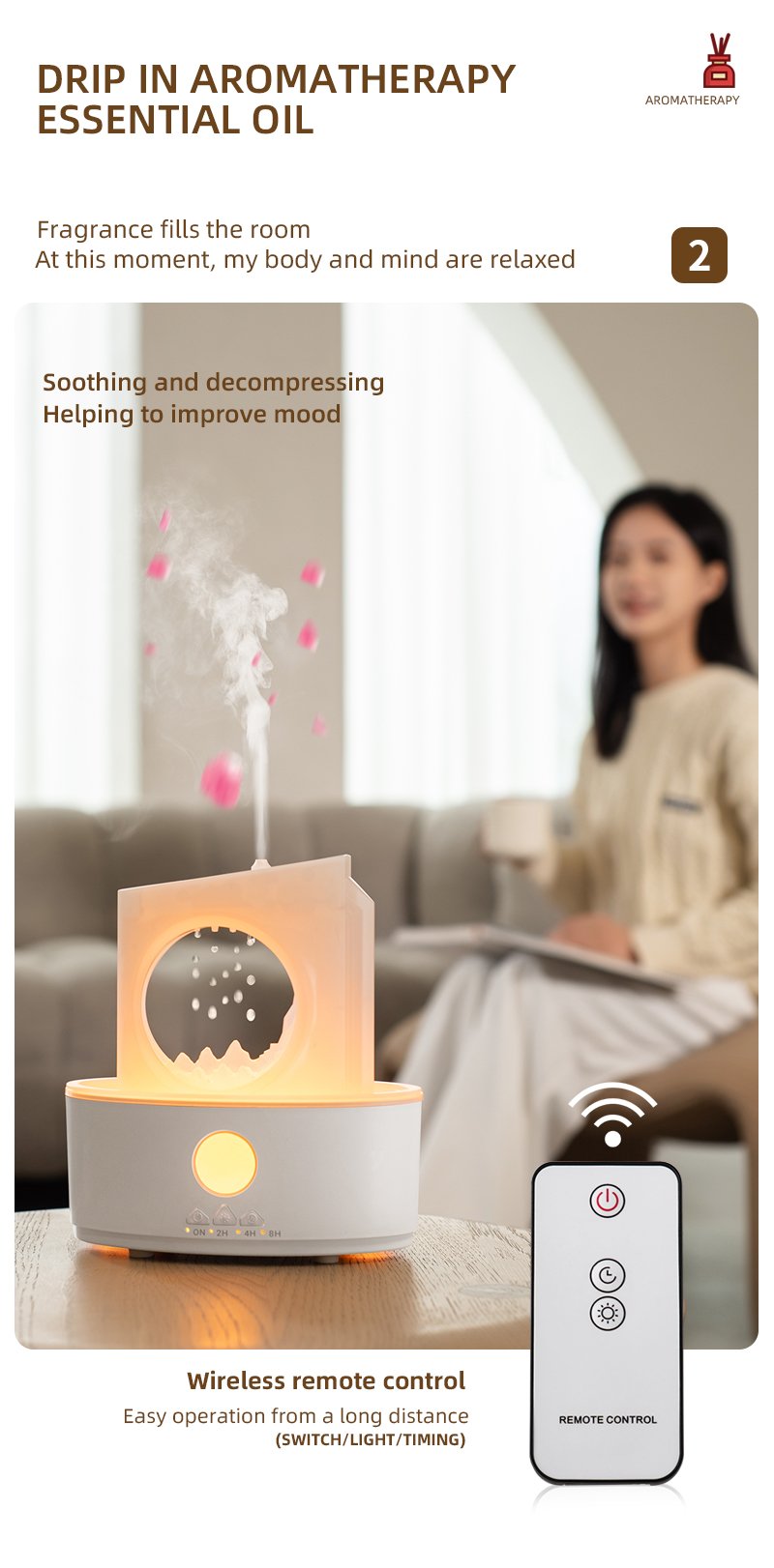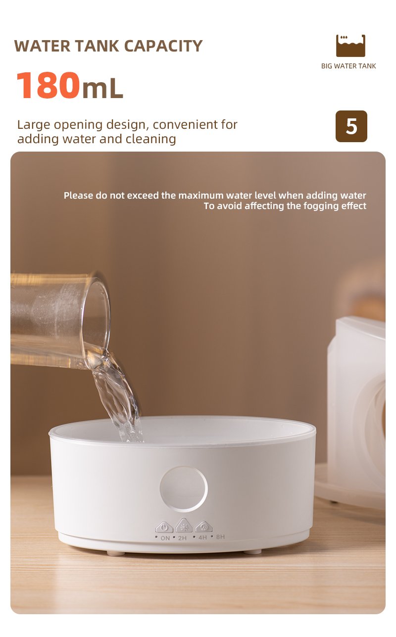 Quiet Operation & Timer Settings: Operates silently and offers three timer options (2H, 4H, 8H) for customized diffusion and humidification, aiding stress relief and boosting mood.”