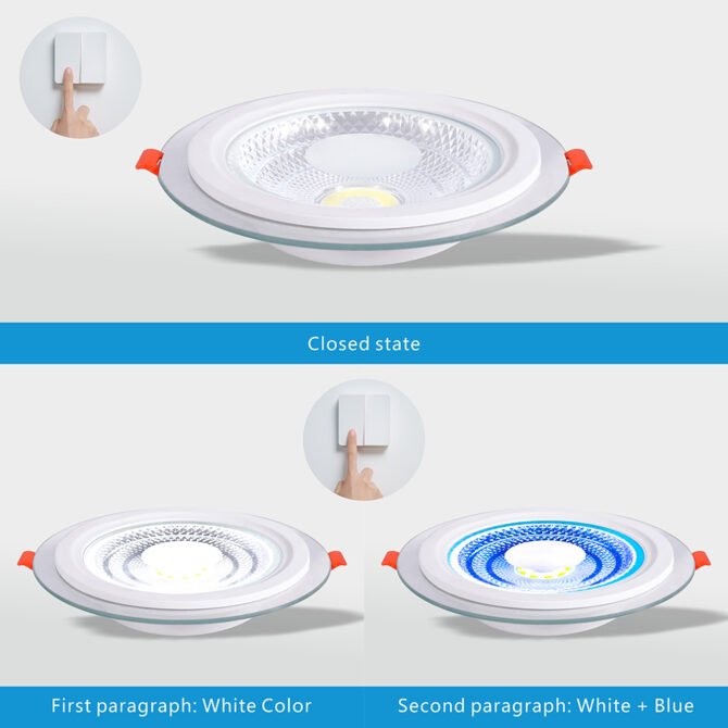 ไฟดาวน์ไลท์ 8W 12W แสงสีขาวอุ่น + แสงสีน้ำเงิน + แสงสีม่วง Ra=85 630 ลูเมน ไฟดาวน์ไลท์ไตรคัลเลอร์ ไฟสปอตไลท์ฝังพลาสติก LED สำหรับบ้านและสำนักงาน ไฟดาวน์ไลท์เพดาน