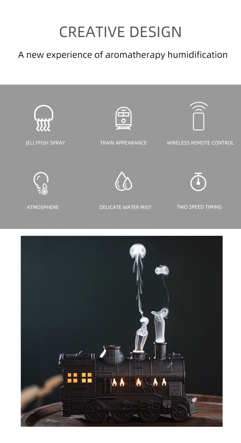 1 กล่อง = 24 ชิ้น 300 มล. เครื่องกระจายกลิ่นอโรมาเธอราพีรูปทรงรถไฟขนาดเล็ก เครื่องกระจายกลิ่นอโรมาเธอราพีแบบละอองเย็นอัลตราโซนิก เครื่องทำความชื้นในอากาศพร้อมโคมไฟ LED เครื่องกระจายกลิ่นอโรมา