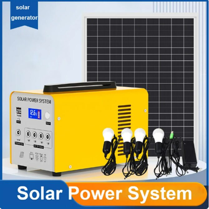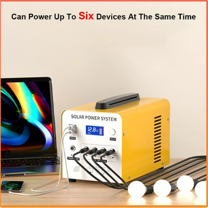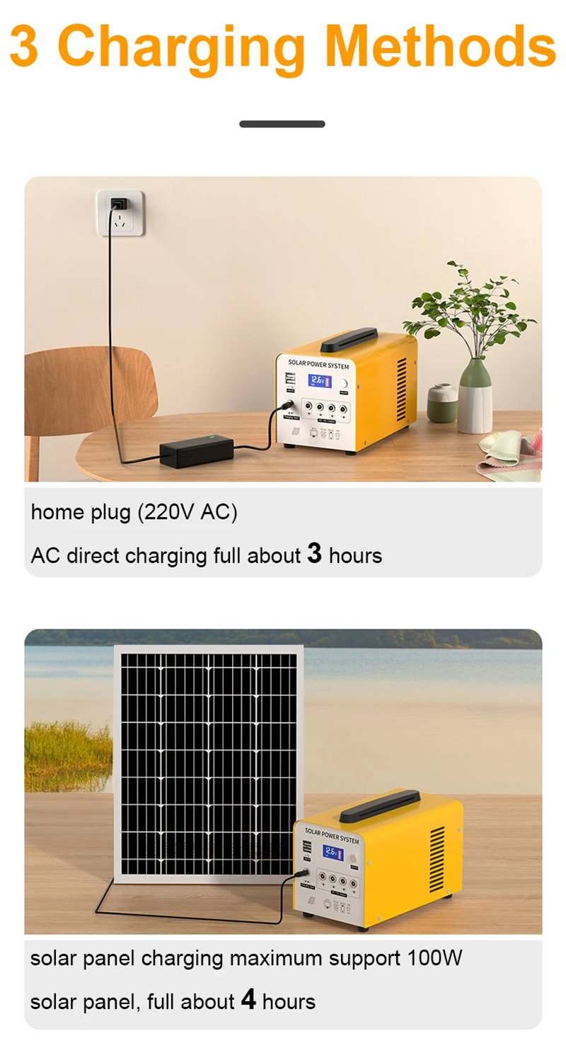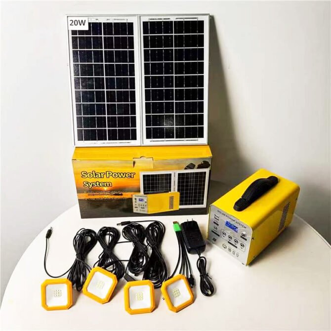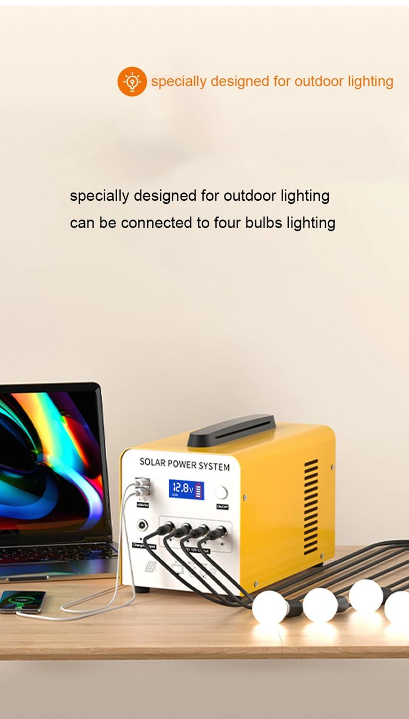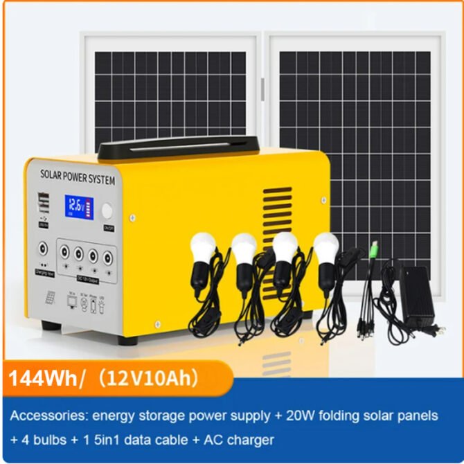 Accessories Of LiFePO 144Wh set: 1pc solar generator, 20w solar panel, 2pcs 5w light bulb, 1pc AC charger, 1pc 5m USB cable