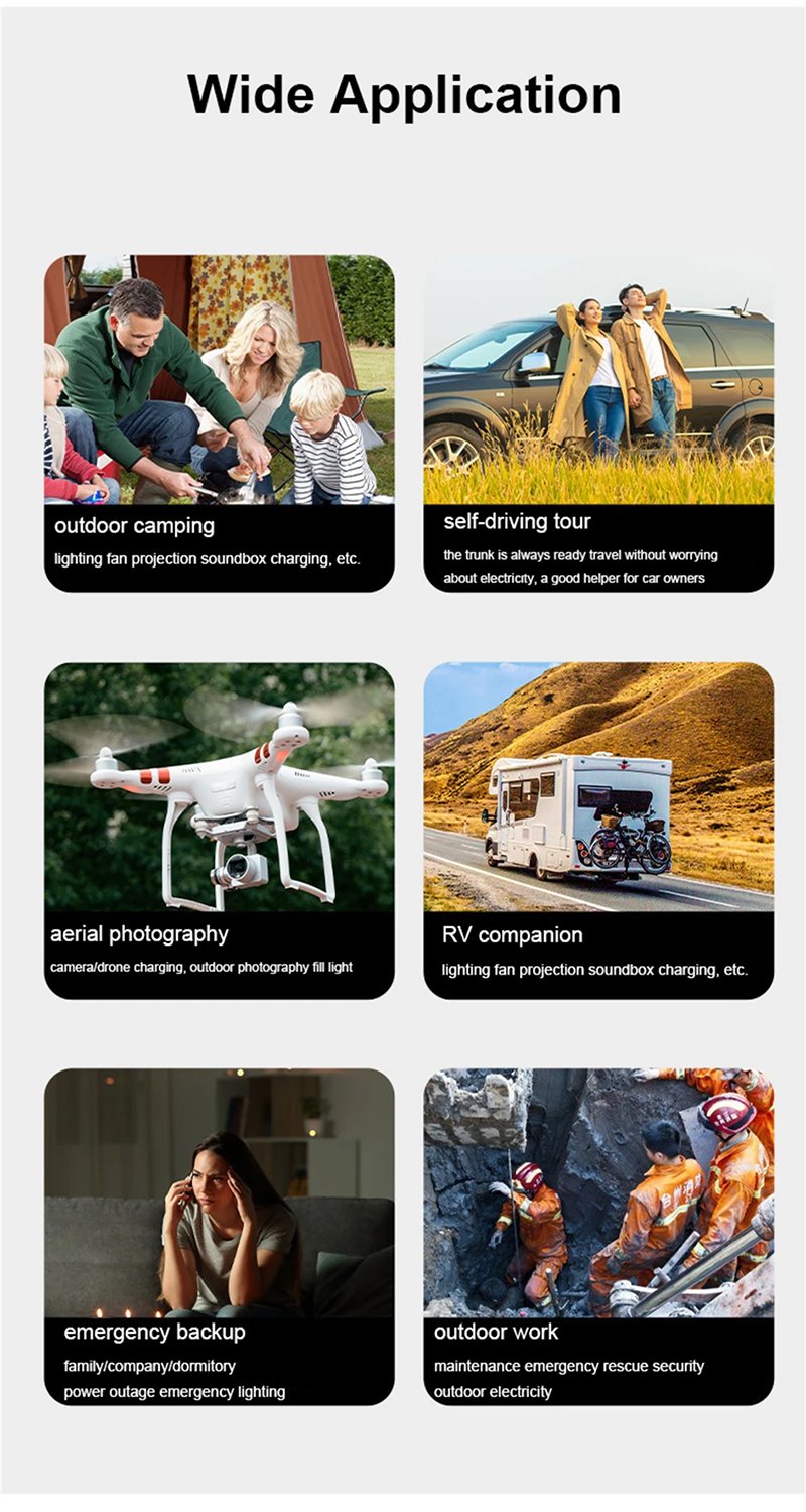 Application Scope: outdoor camping(lighting fan projection soundbox charging, etc.); self-driving tour; aerial photography(camera/drone charging, outdoor photography fill light); RV companion(lighting fan projection soundbox charging, etc.); emergency backup(family/company/dormitory power outage emergency lighting); outdoor work(maintenance emergency rescue security outdoor electricity)